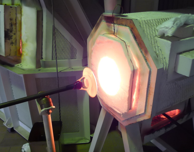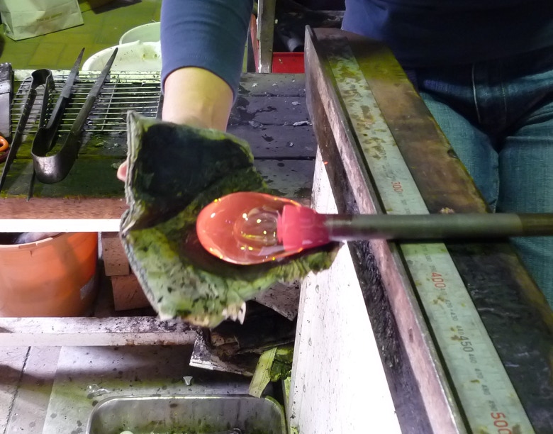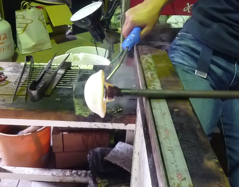 ガラスが冷える前にグローリーで焼き直しながら作業します。