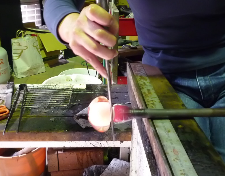色ガラスの方の竿は冷めすぎないように確認しながら…。