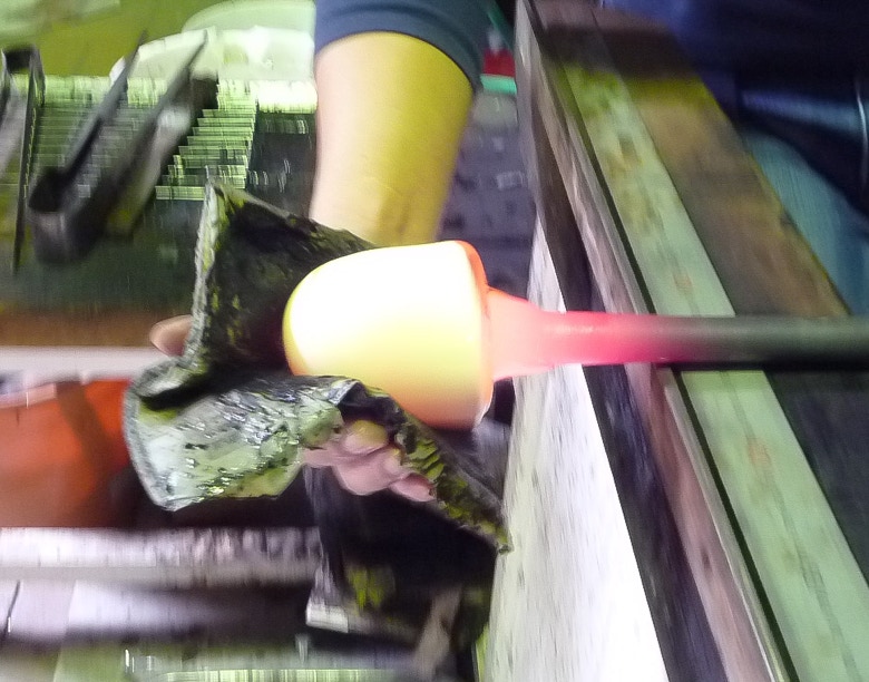色ガラスが大きい時は竿に糊代わりにクリアガラスをちょっと付けることもあります。