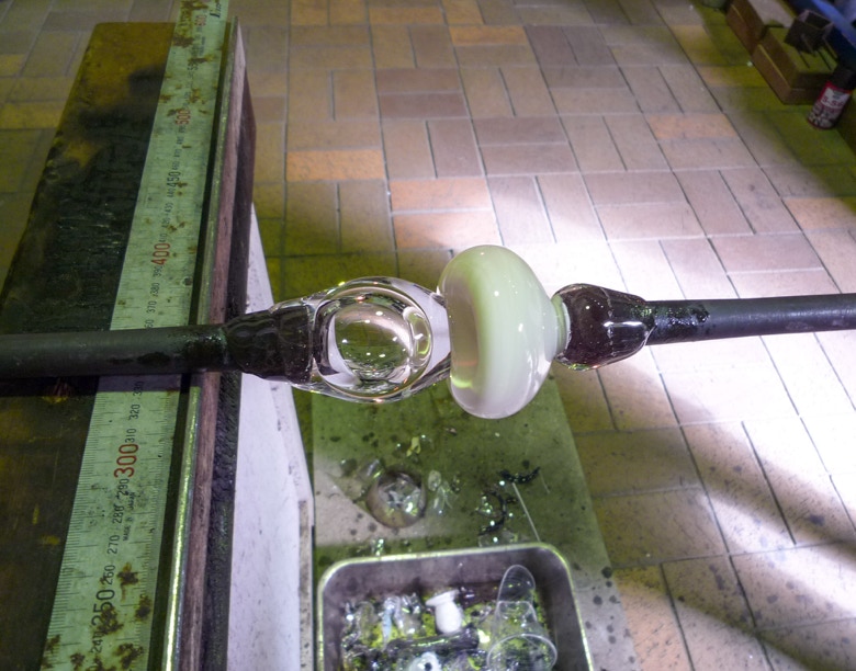 下玉のクリアガラスが焼けない様に、色ガラスをしっかり焼いて回すと